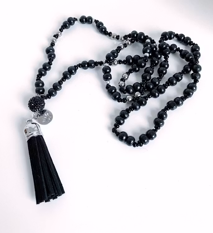 Halsbandet är handknutet med svarta träpärlor, seedbeads och pärlor i rostfrittstål. Halsbandet har en glittrig shamballa pärla, svart mockatofs och en berlock med en lotusblomma.